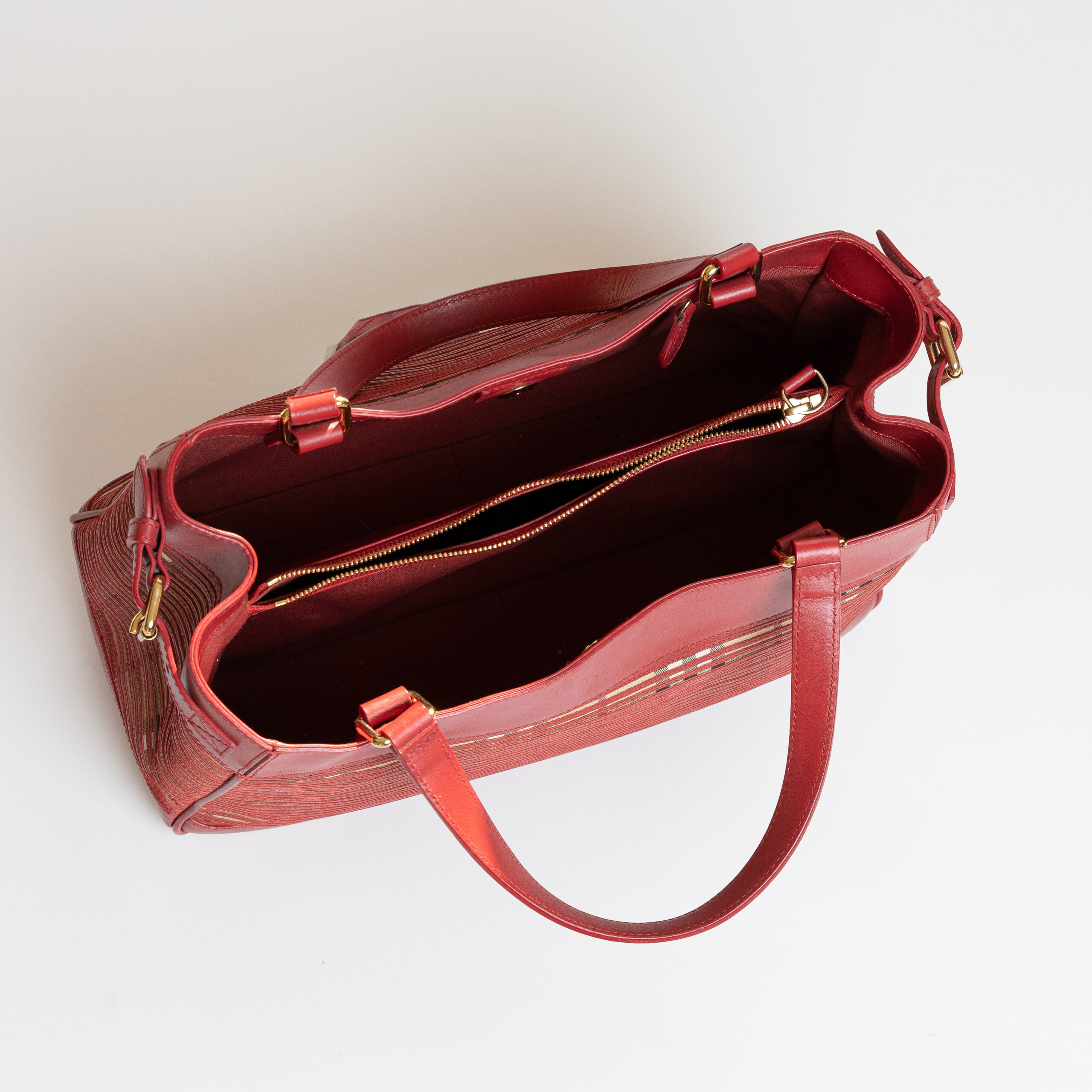 Torba u kombinaciji klasičnog Check platna i crvene glatke kože.