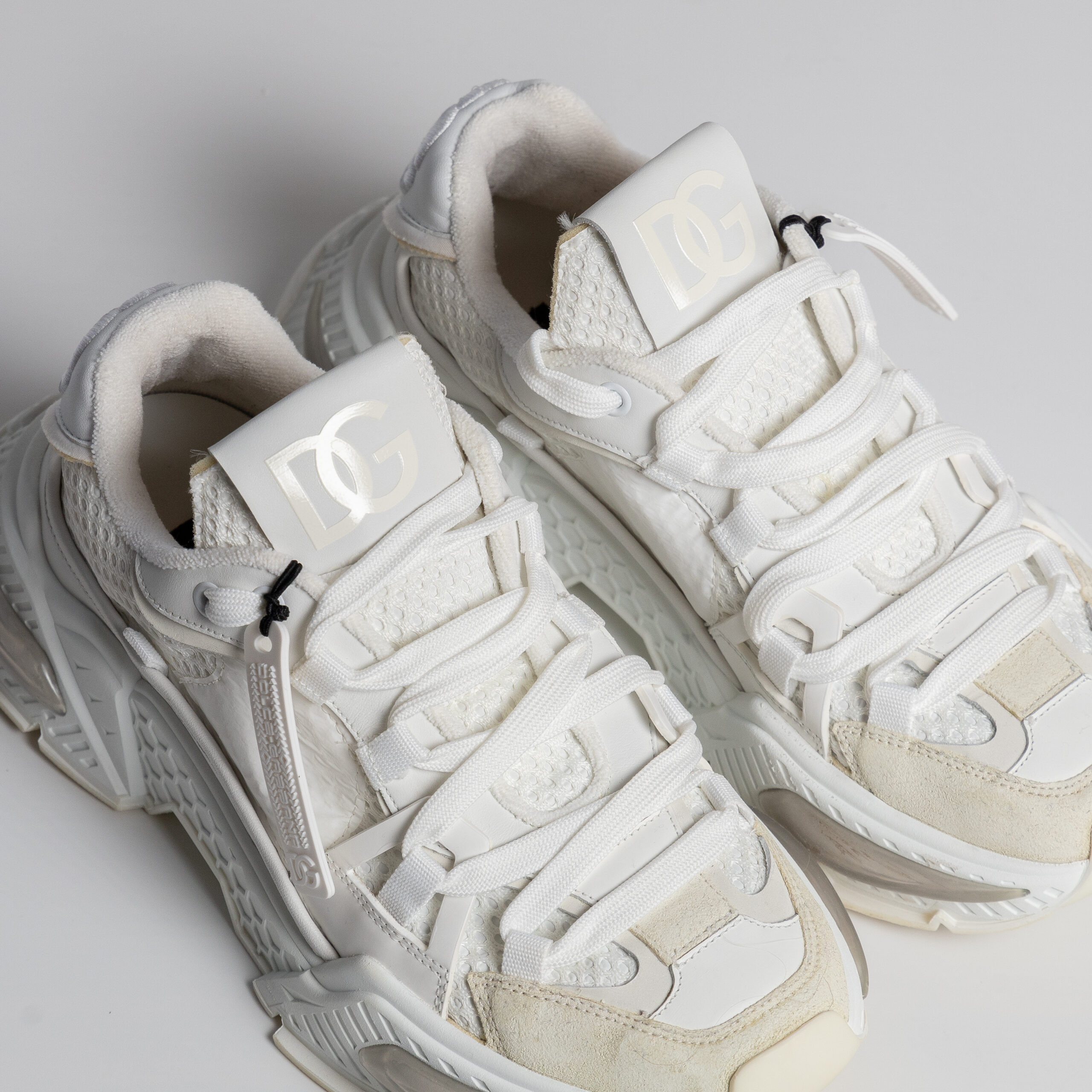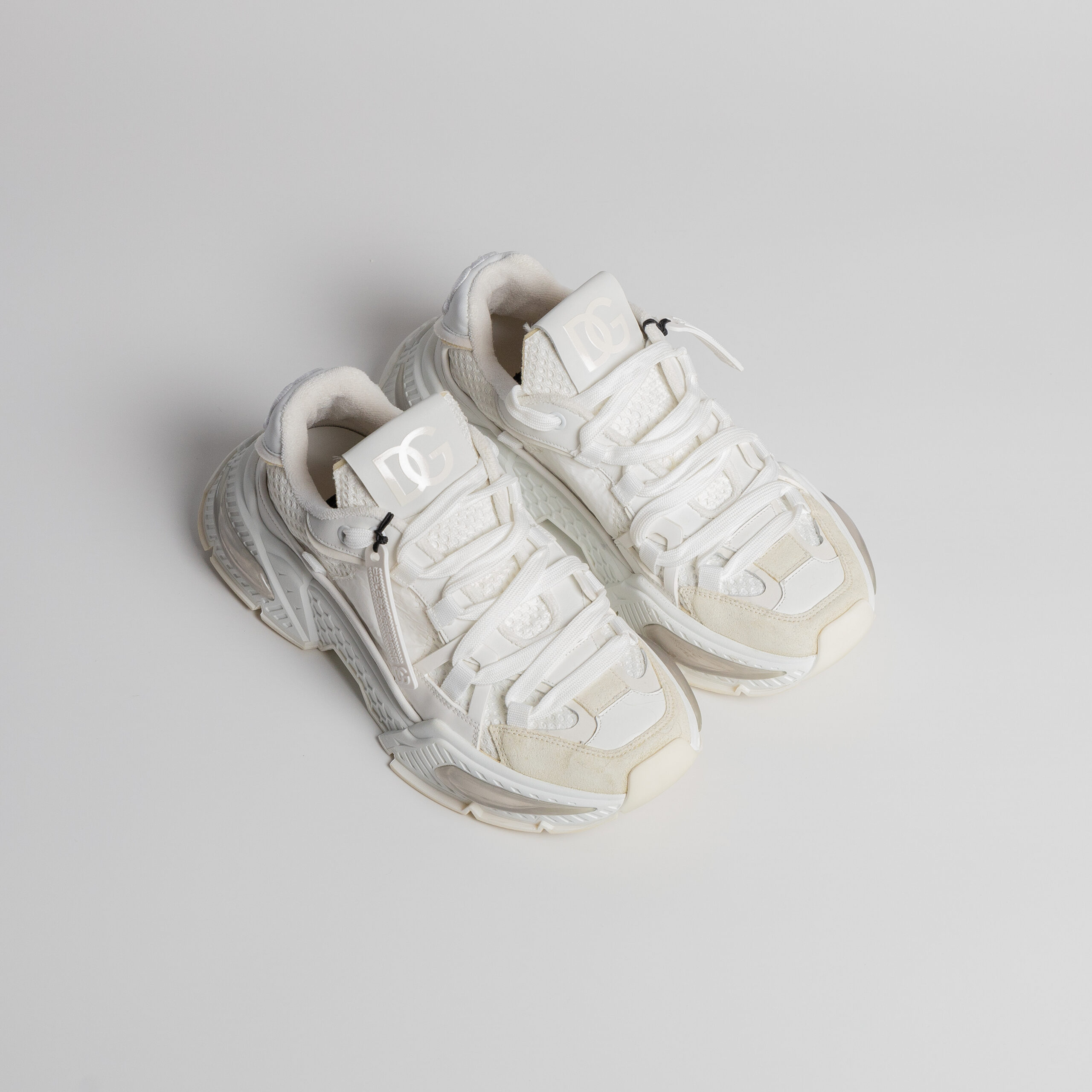 Luksuzne Dolce & Gabbana Daymaster patike u beloj nijansi. Imaju Madigan djon sa reljefnom strukturom, kombinacija kože i mrežastog materijala. Na prednjem deli vidljiva promena u nijansi kože. Na unutrašnjoj strani (gazištu) postoji blago ispupčenje, nevidljivo spolja.