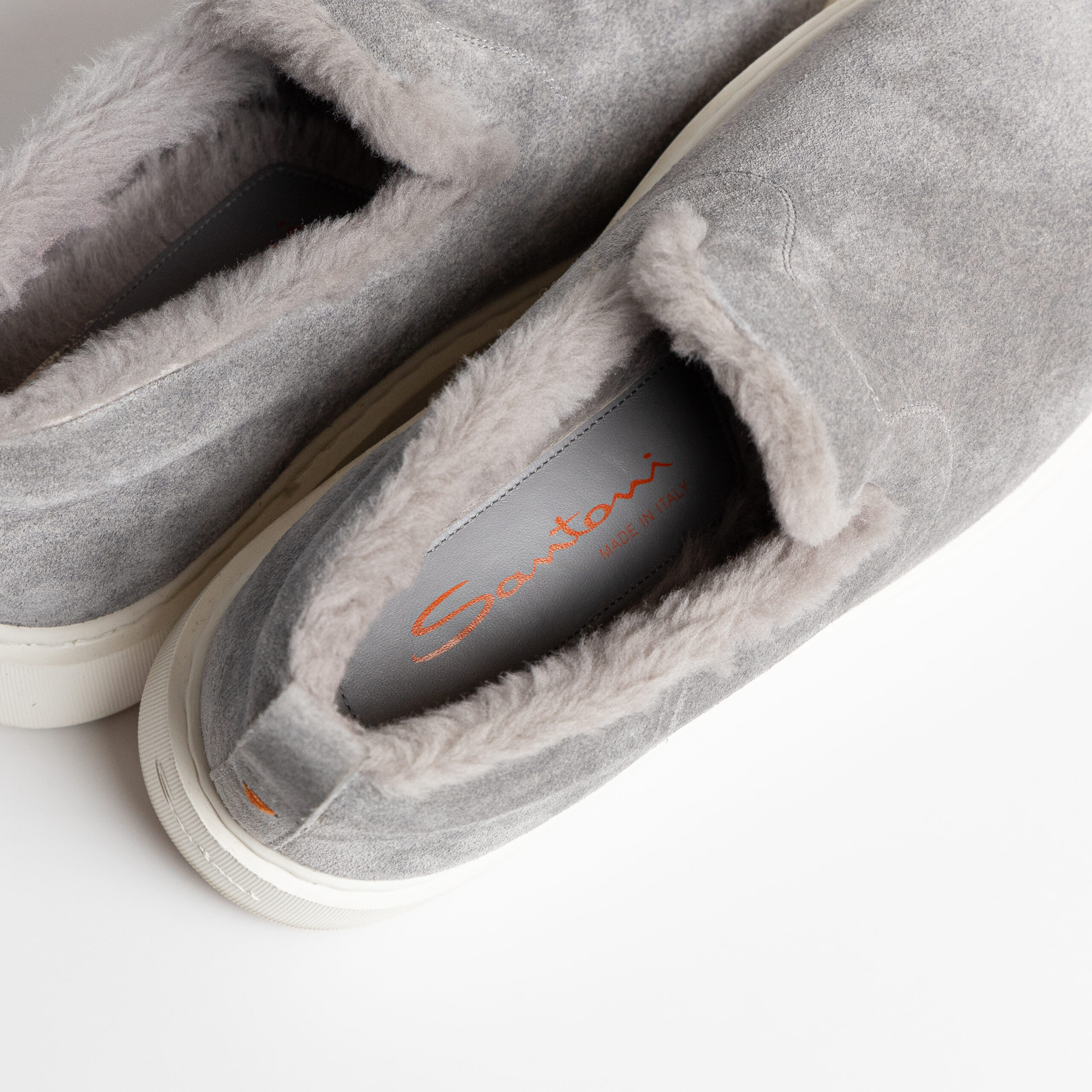 Santoni slip- on od prevrnute kože, obložene prirodnim krznom. Djon izradjen od kvalitetne gumene osnove.